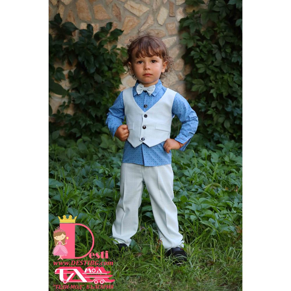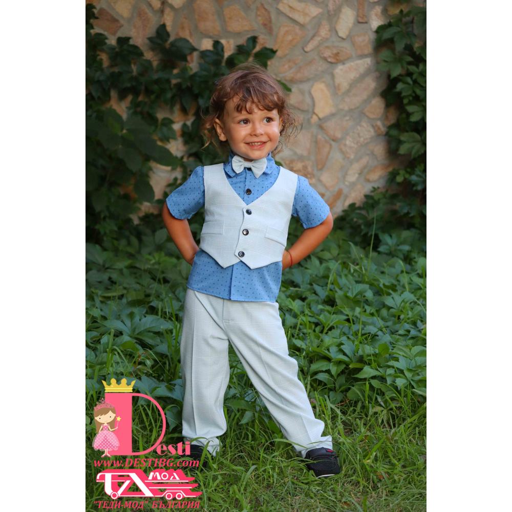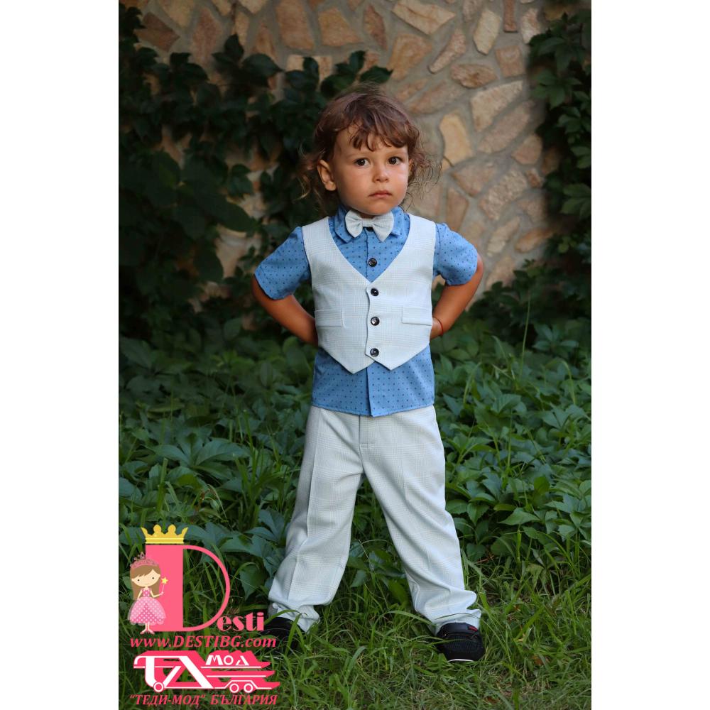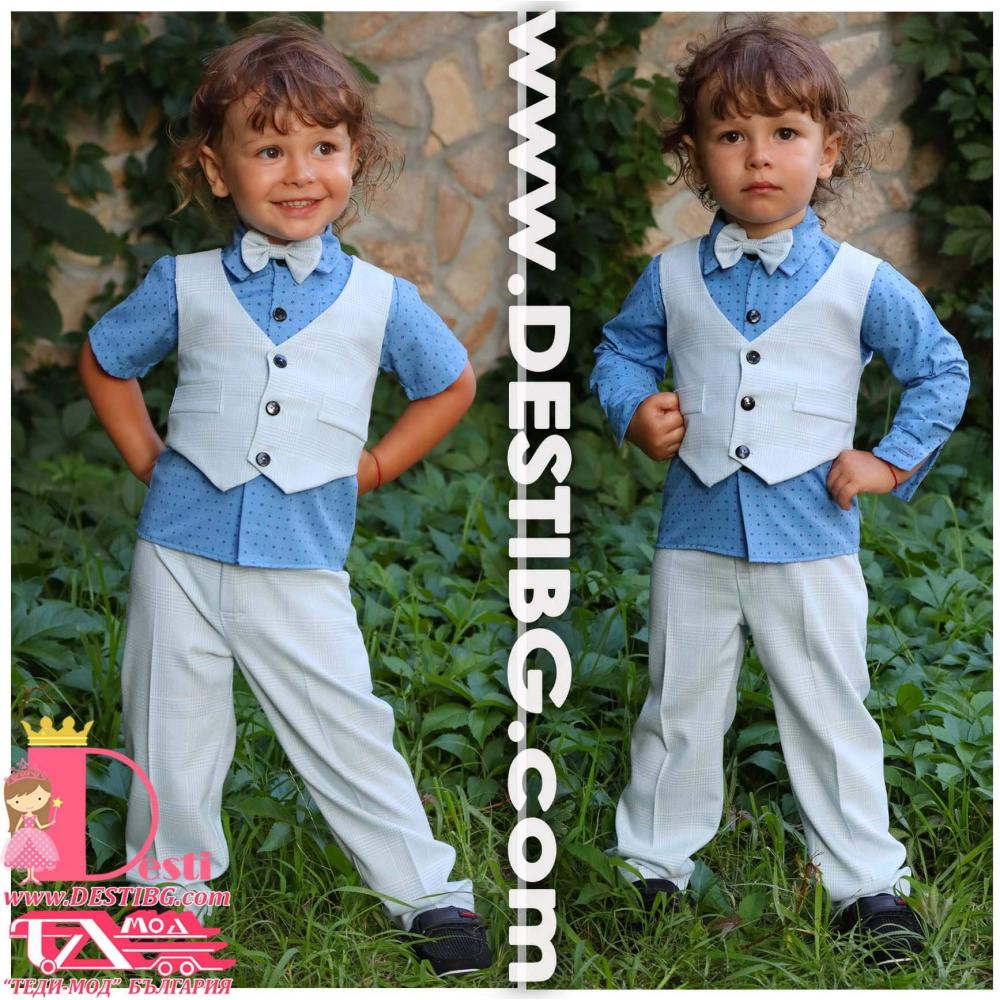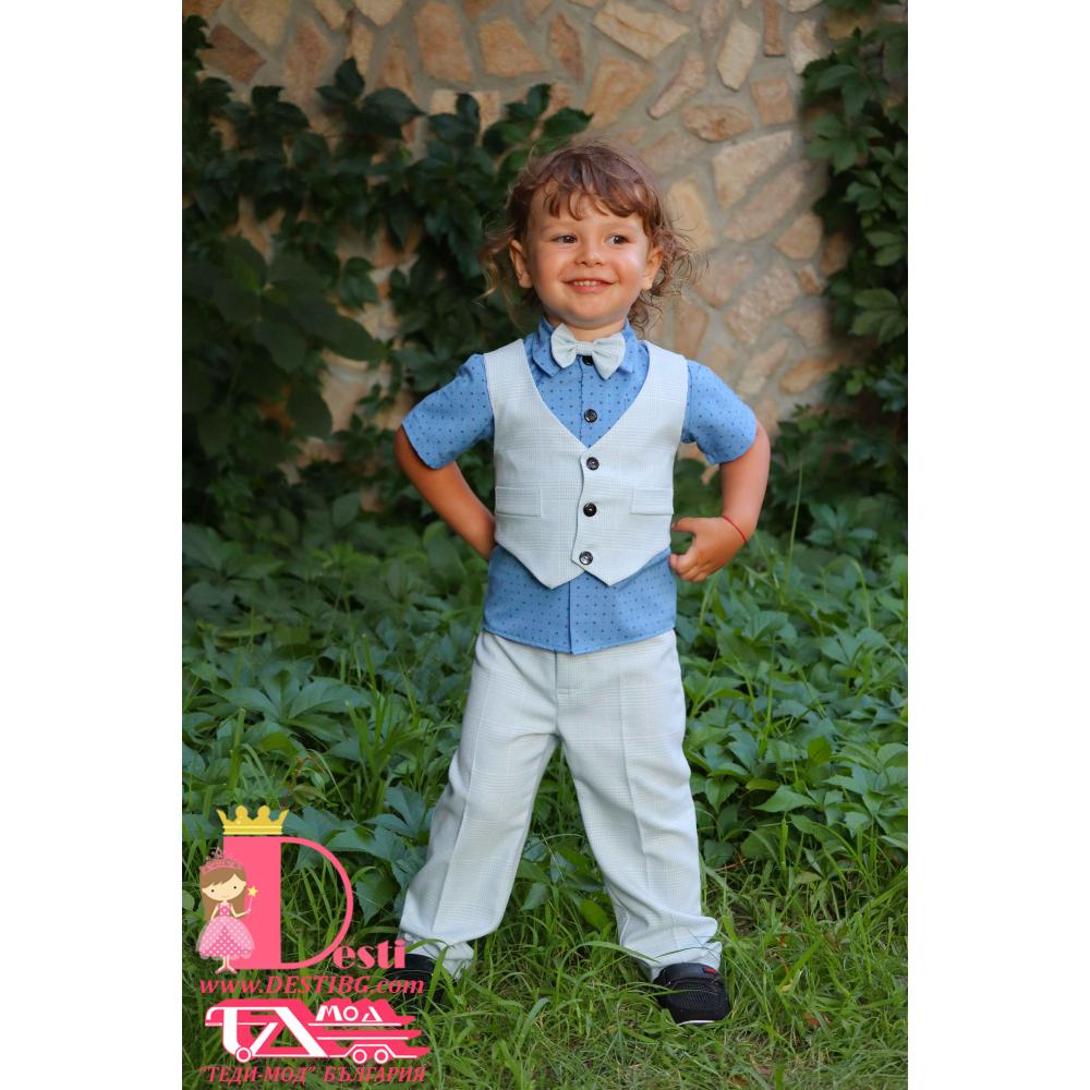 1. Мъжки костюм от 4 части - светло син кариран панталон, риза с къс ръкав от поплин, папийонка, елек.