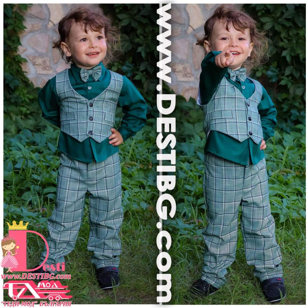 1. Мъжки костюм от 4 части - светло сив кариран панталон, риза с къс ръкав от ранфорс, папийонка, елек.