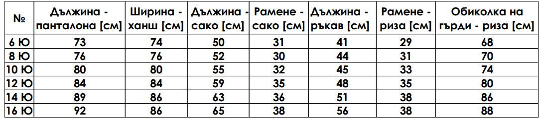 2. Включва панталон, вратовръзка в различни цветове, риза, елек и сако.