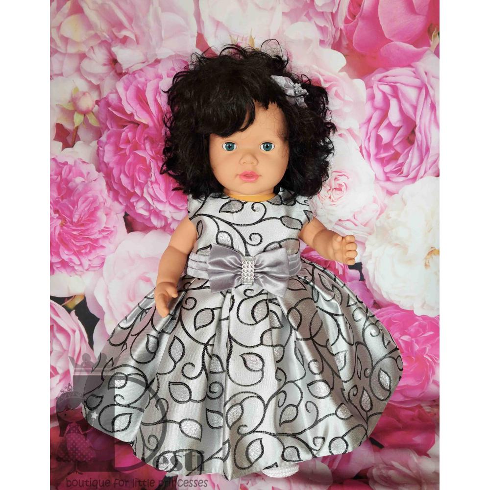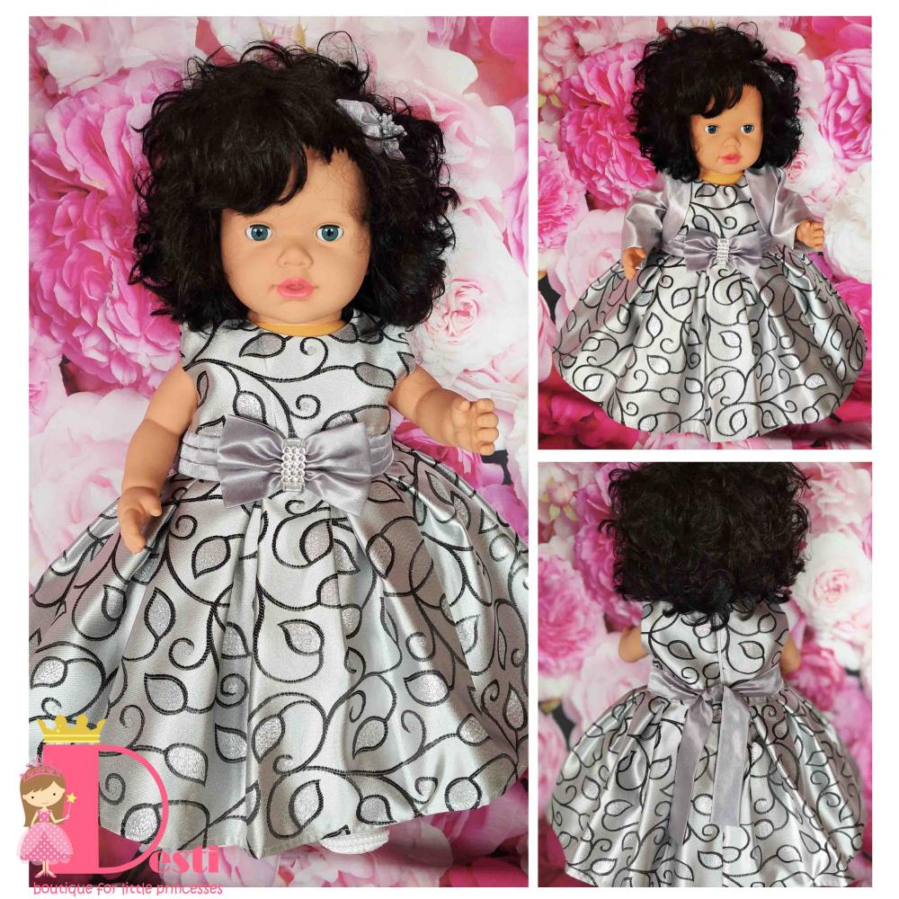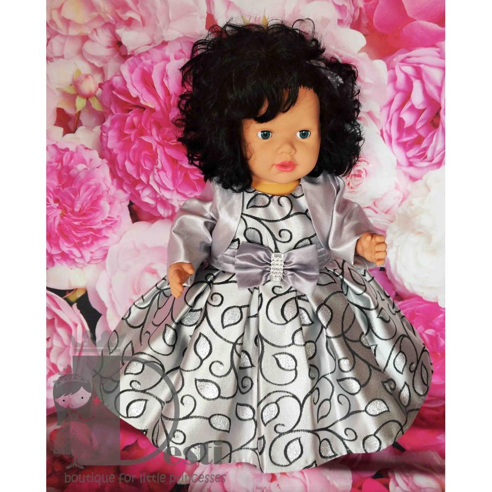 2.Роклята е изработена от релефен, бродиран, нееластичен жакард със сребристи нишки.