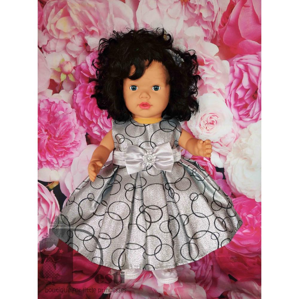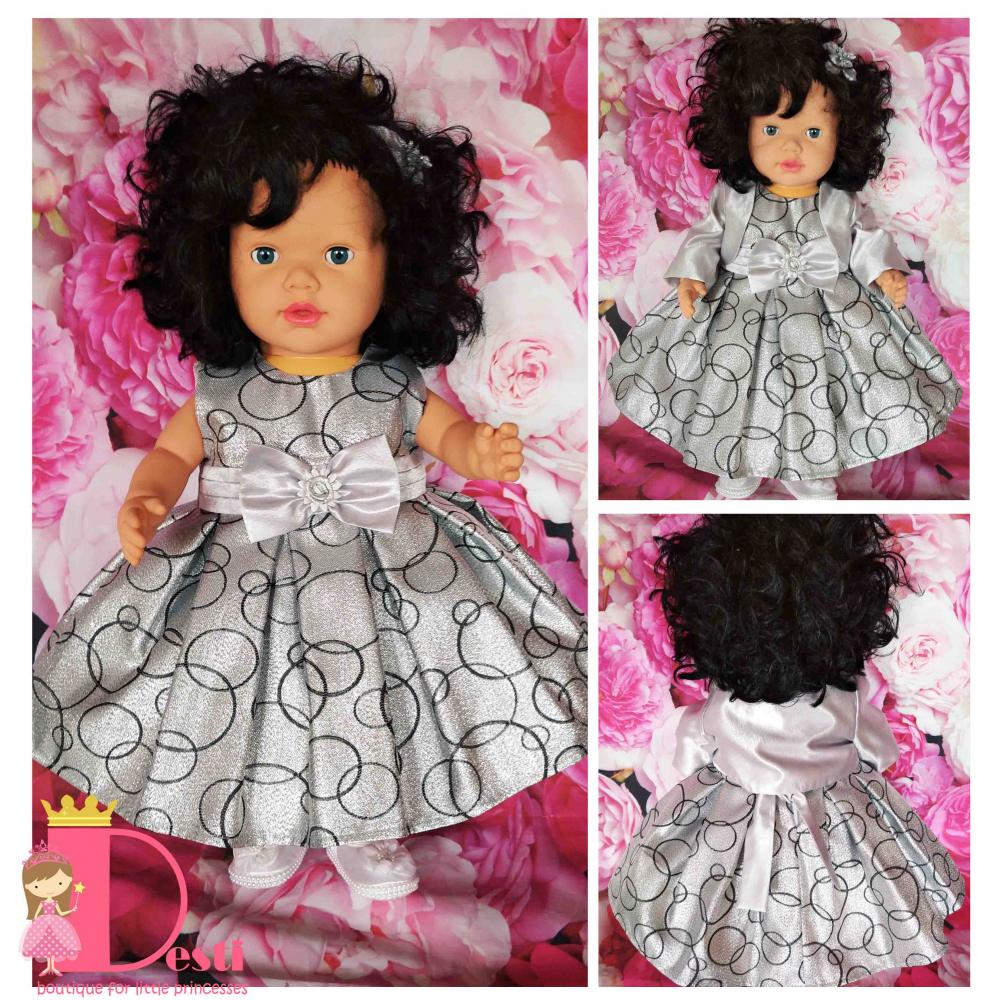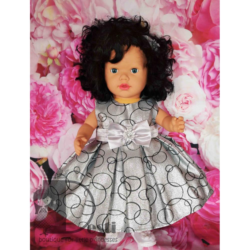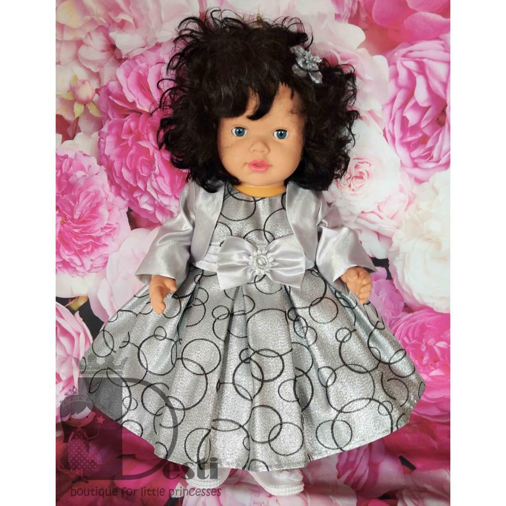 2.Роклята е изработена от релефен, бродиран, нееластичен жакард със сребристи нишки.