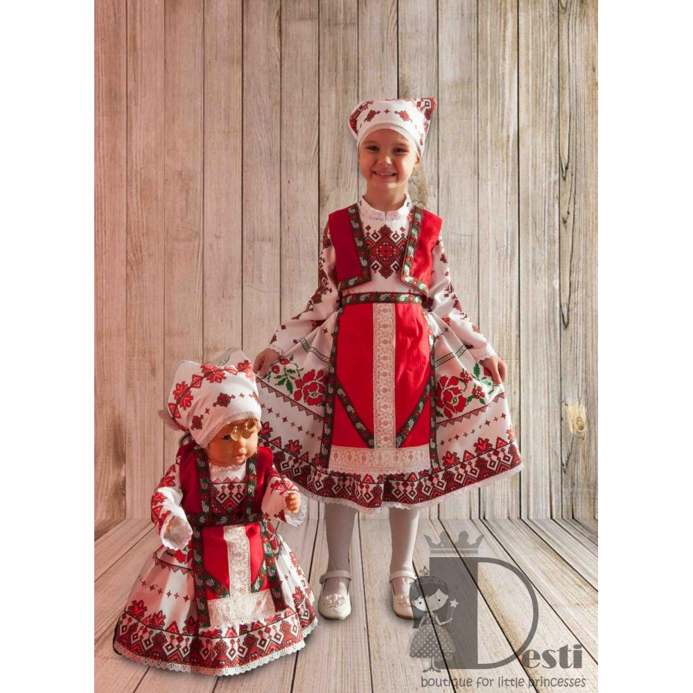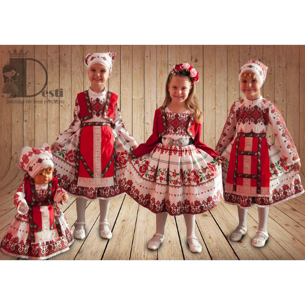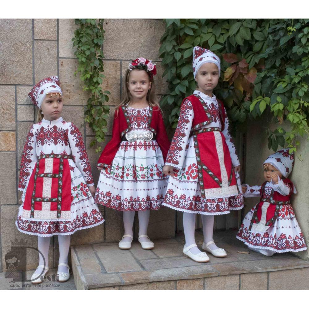 2.Стилизирана народна носия изработена от щампован памук тип "бродерия", включваща рокля с ръкав, престилка с шевици, забрадка, елек.